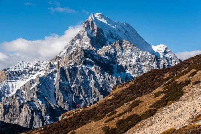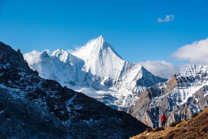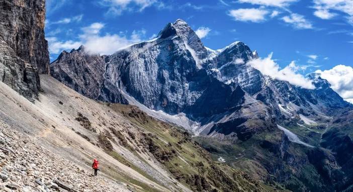 (徒步者身处央迈勇南坡的山崖下)