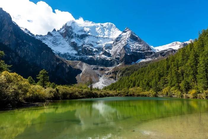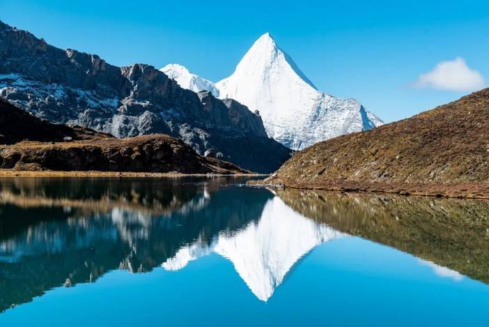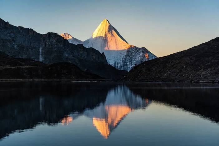 (清晨的蛇湖水面平静,倒影出央迈勇峰)