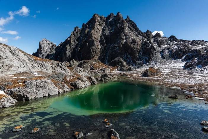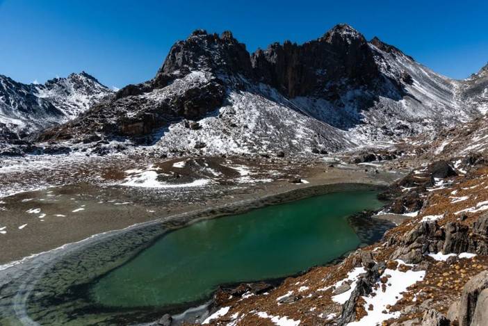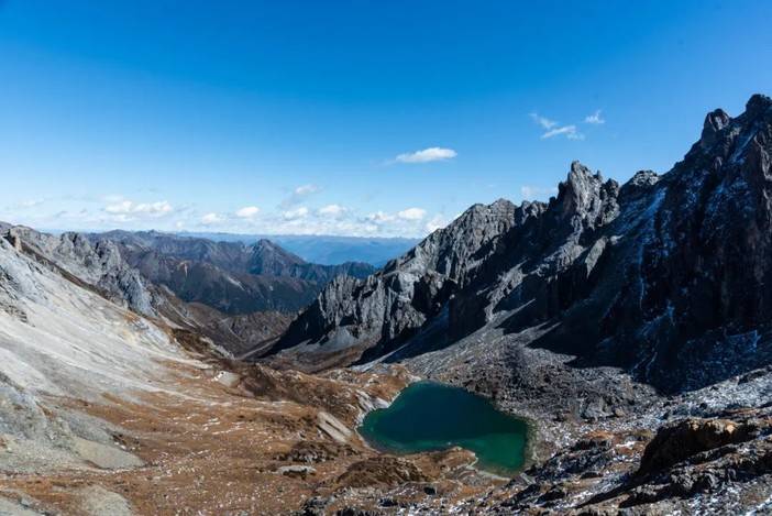1海拔4750米的蛇湖垭口再走一百多米即可俯瞰碧绿的蛇湖以及右前方的仙乃日以及右方的央迈勇。蛇湖几乎算是亚丁周围面积最大的海子,为狭长的锥形,东西长约1.4公里。以央迈勇的冰川融水以及降雨为主要水源补给。