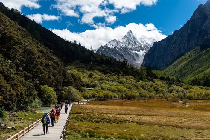 垭口之后的路段一路下坡,直到遇到景区的游览栈道。顺着栈道行进就可以到达亚丁景区的标志性景观之一的珍珠海。再徒步1.5公里就可以到达徒步的起点—冲古寺。顺利结束本次为期7天的亚丁大转山徒步之旅。