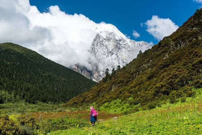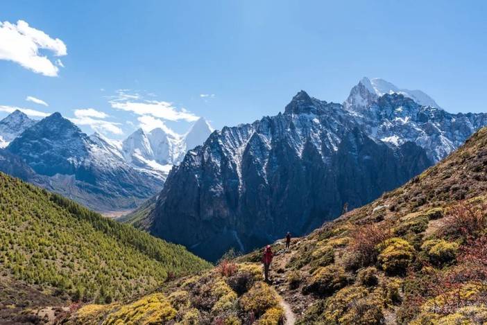 (灌丛中的徒步者,背后为央迈勇(左)和仙乃日)