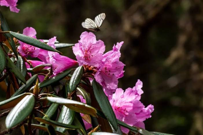 从卡斯牛棚到松洛垭口的距离有5公里左右,除了垭口前的1公里,其他路段起伏坡度并不是很大,而沿途的植被以高山灌丛为主,其中有数百米的山路两侧遍布高山杜鹃,五六月的花期分外耀眼。