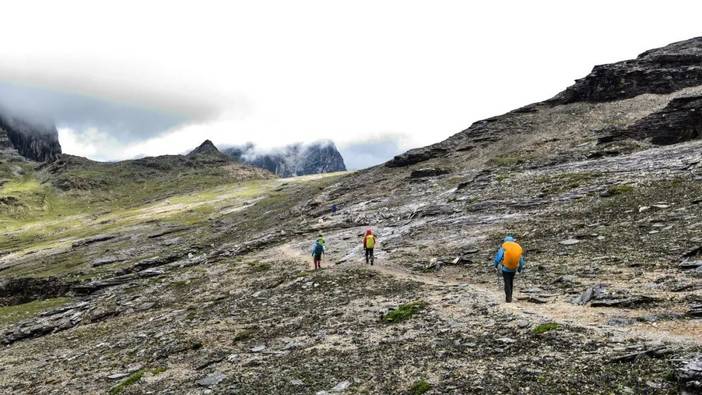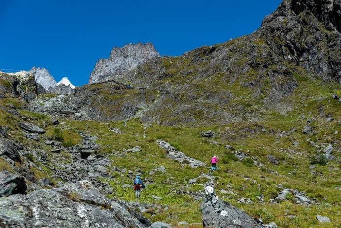 (徒步者行走在风险较大的碎石坡)