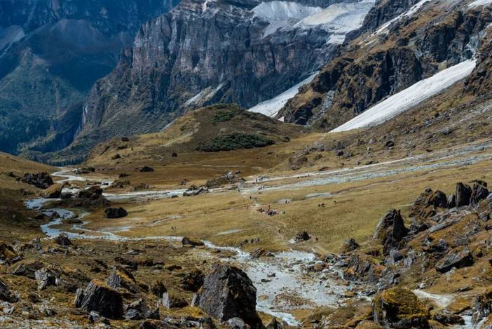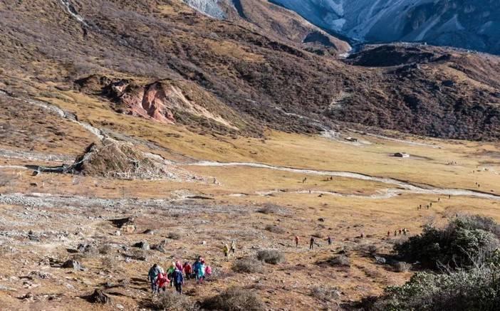 (央迈勇东南坡山谷,注意山谷中休憩的徒步者团队)