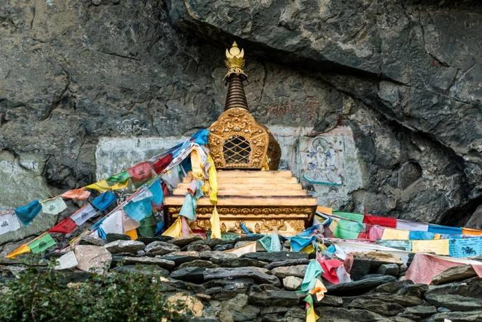 在两段碎石区中间,央迈勇的岩峰悬崖的山脚处,向内凹陷出一个山洞,是转山路上的休息点,此处有一座装饰精美的佛塔,佛塔下方有藏民遗留在此的饰品或衣物,以表达自己的崇敬之心。当年的洛克博士曾在此遇到统辖亚丁地区的匪帮首领,在其允诺之下,洛克博士才得以有了2次亚丁之行。(原计划中的第三次亚丁之行,由于匪首的阻止而未能成行)