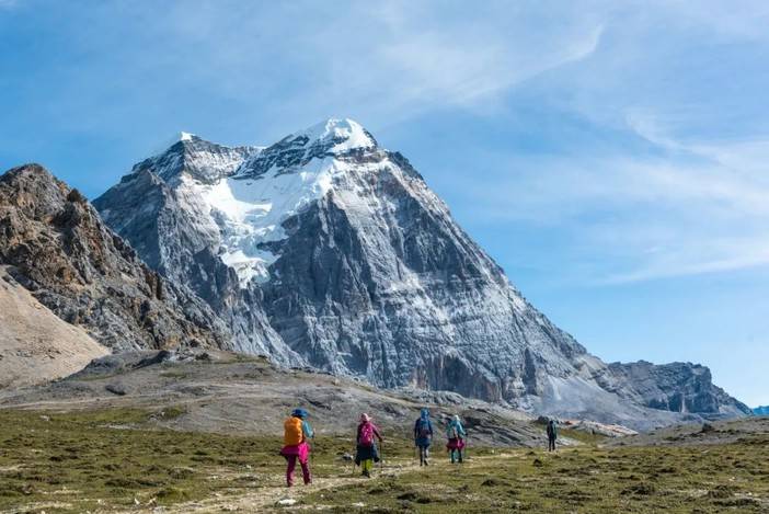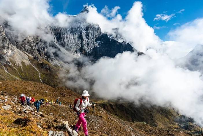 新果牛场到黑湖垭口的爬坡长达4.3公里,这也是全程最大的挑战。不过到了徒步第五天,大部分徒步者均已经适应了高海拔,体能状态会有不同程度的恢复。这一段也是非常适合拍摄风光照片的路段,伟岸俊美的央迈勇就在徒步者身后相依相伴,如同一位天降神兵。