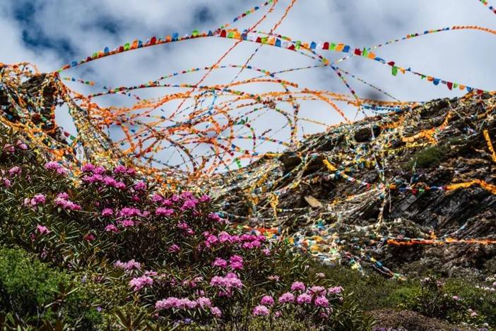 (松洛垭口的经幡与盛开的杜鹃花)
